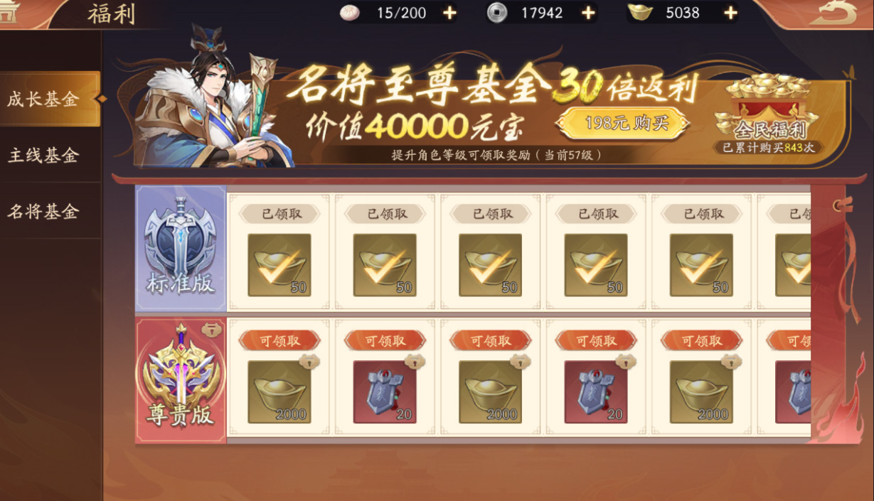 氪佬方面同样建议特权及月卡拉满,其次就是战令和基金,三个基金都能在让你在前期极快的发育,大量获取资源,前期即可拿下多套红装和大量招募令,可大量获取武将,和解锁图鉴。这些都能帮你更加简单地推图,和冲竞技场排名