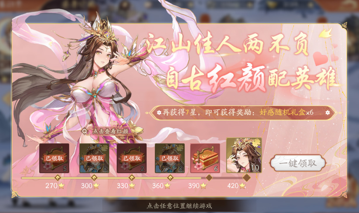 红颜魅力天赋以及好感,星级都能提供大量战力及属性,送礼的盒子可以通过约会以及活动获得,建议均衡升级,提高利用率