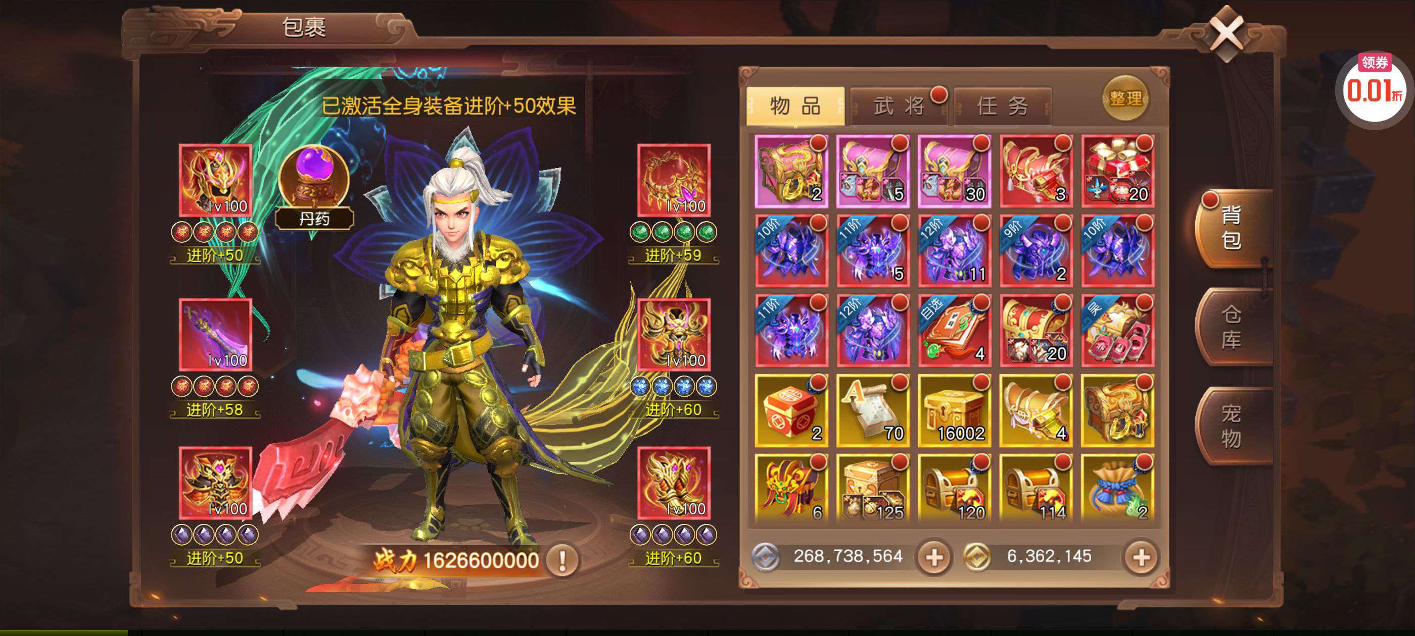 夺宝券*1、比武令*1、5星随机将魂*10(每个账号限领一次)
