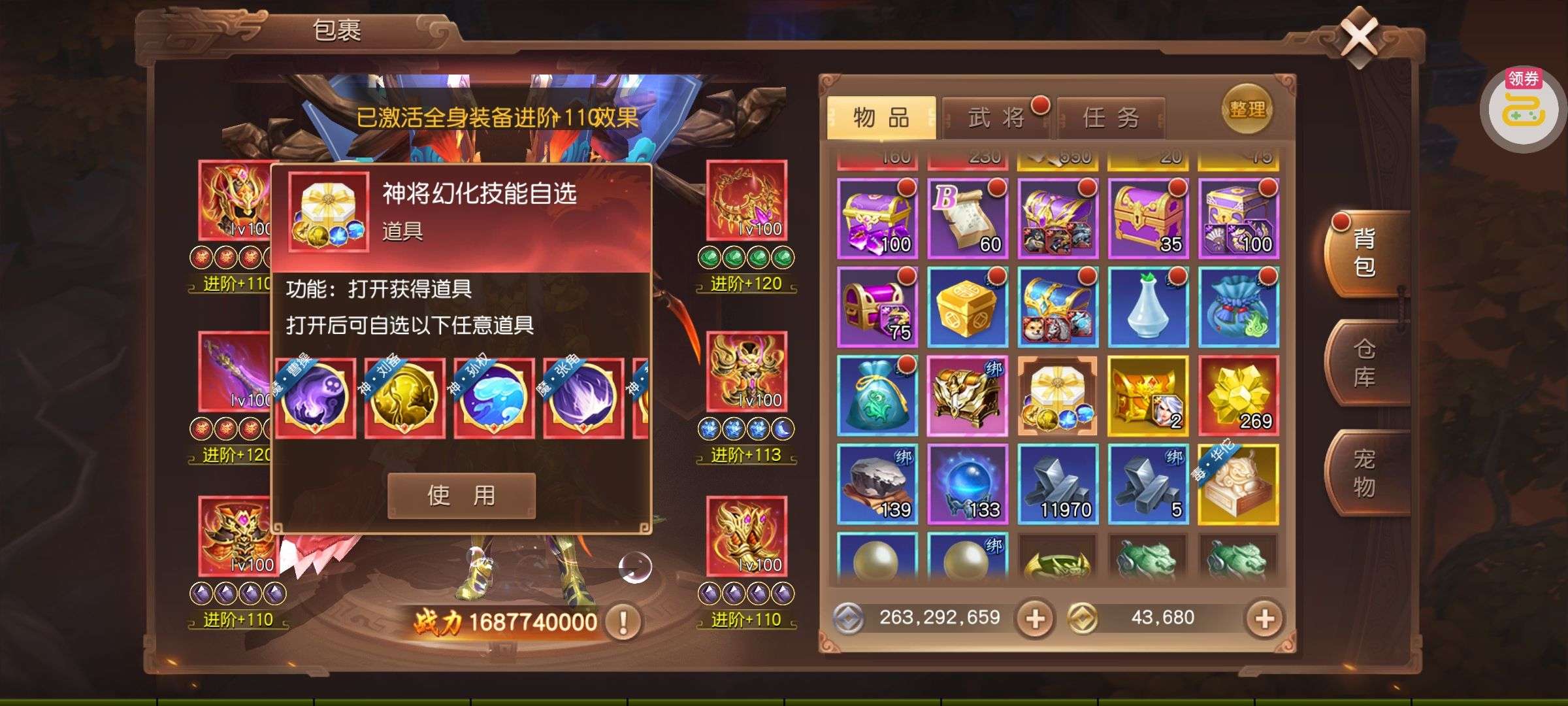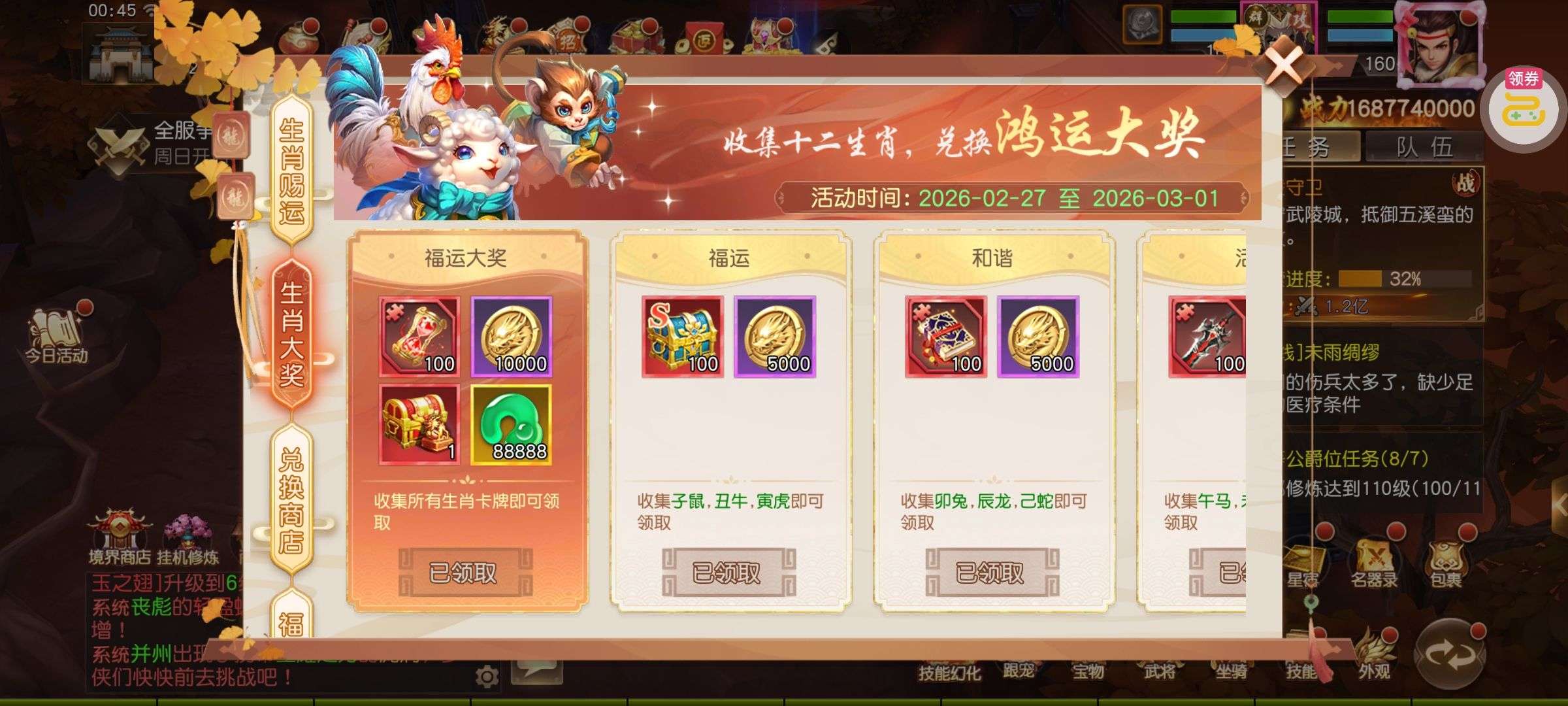 夺宝券*1、比武令*1、5星随机将魂*10(每个账号限领一次)