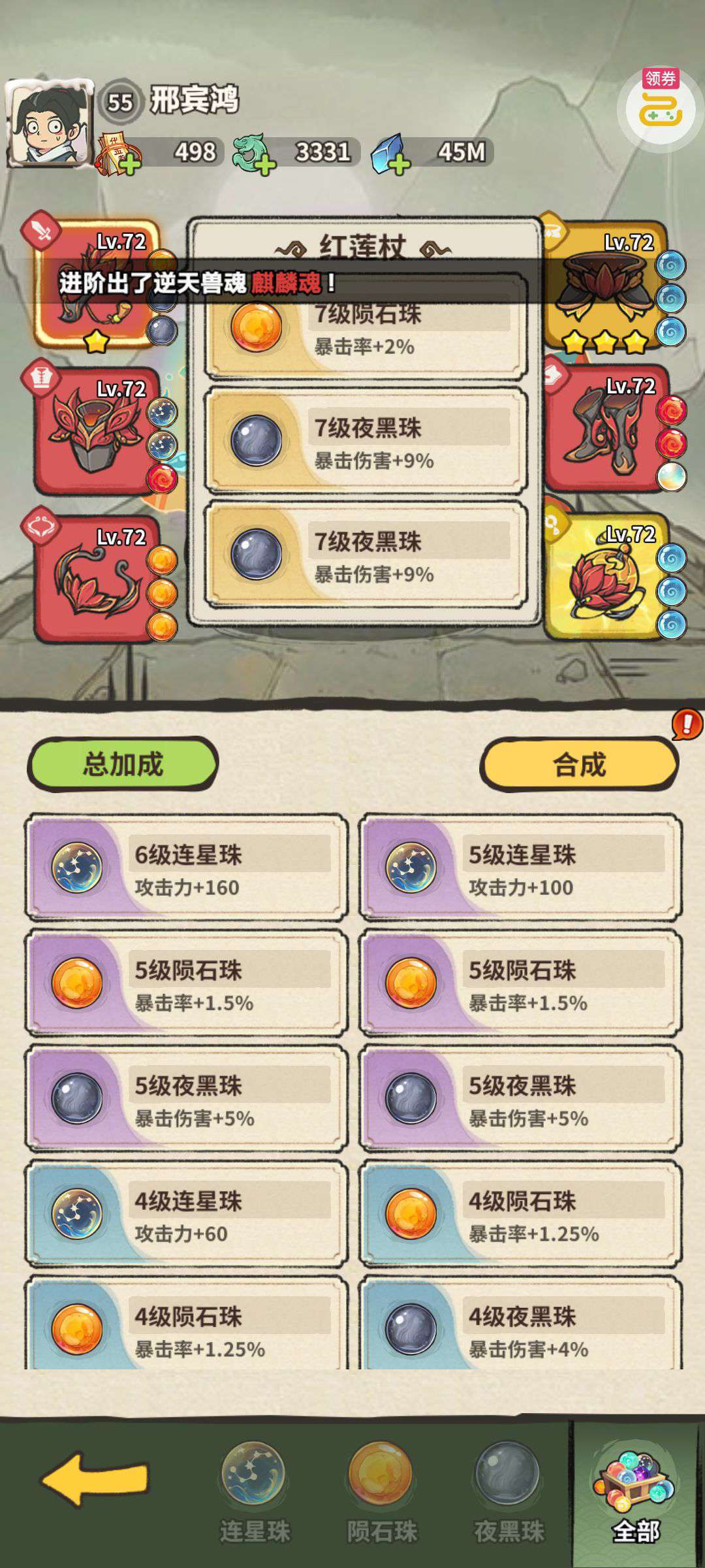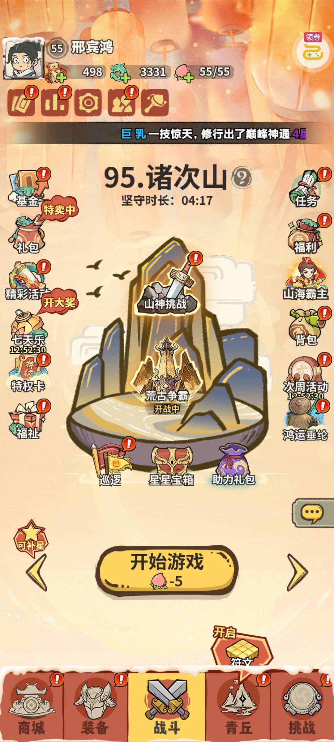 累积500多,特权卡5级,宝物神通都有