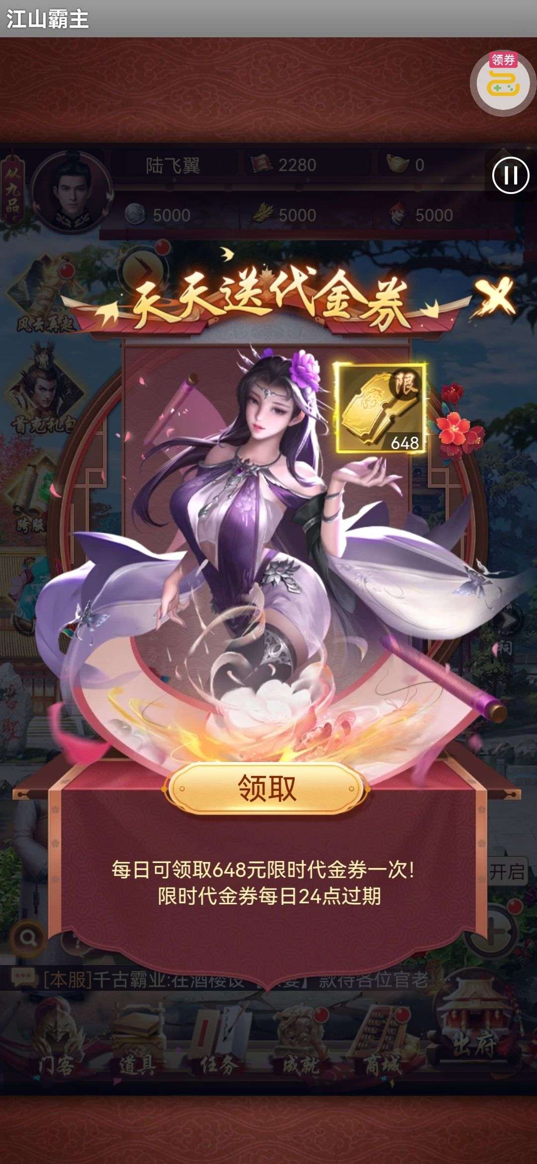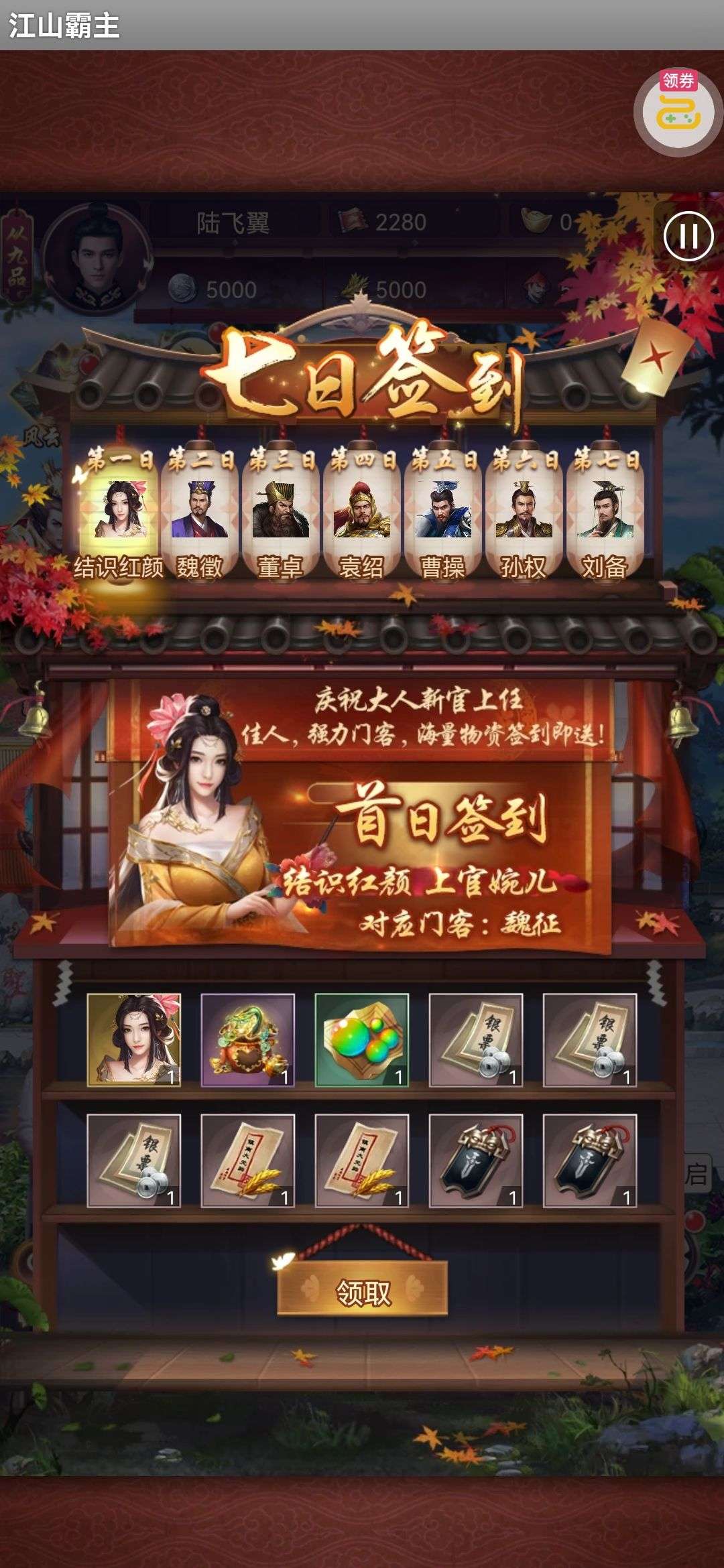 夺宝券*1、比武令*1、5星随机将魂*10(每个账号限领一次)