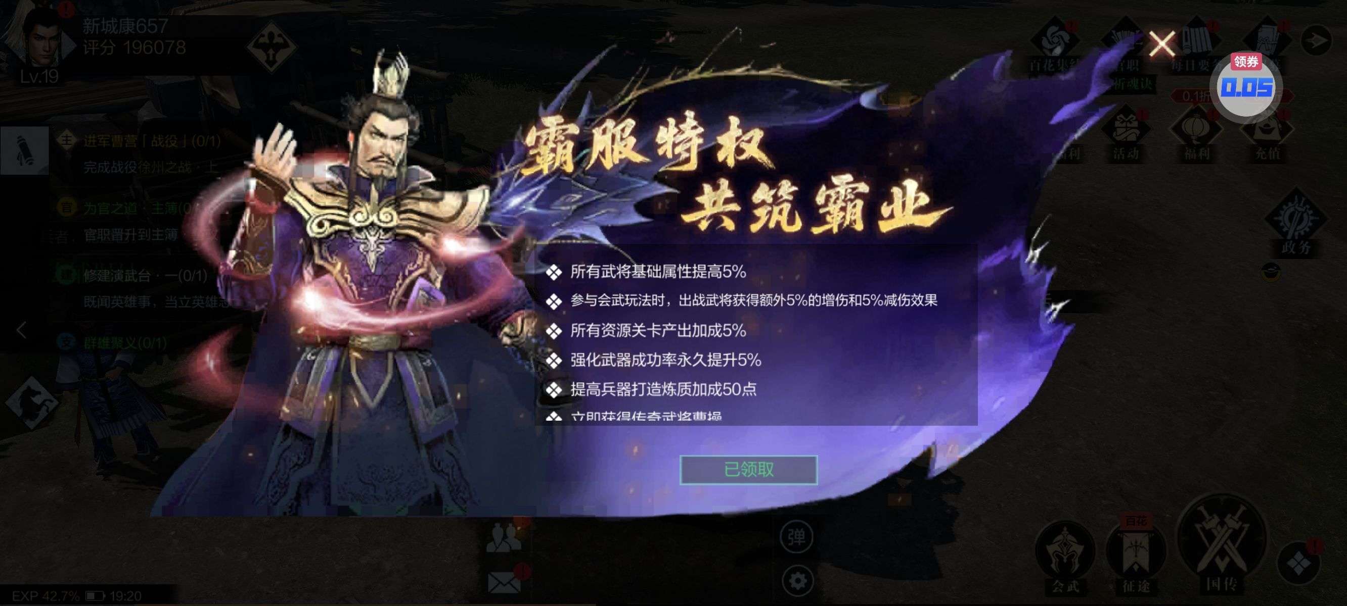 夺宝券*1、比武令*1、5星随机将魂*10(每个账号限领一次)