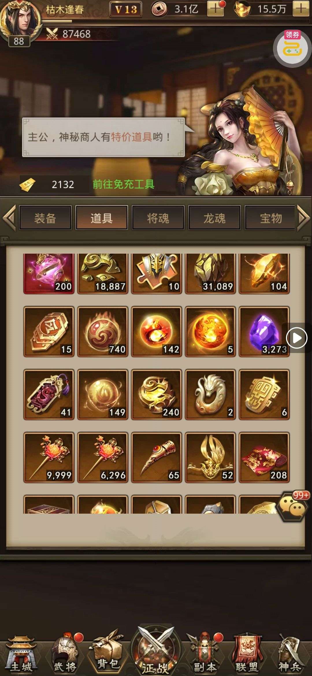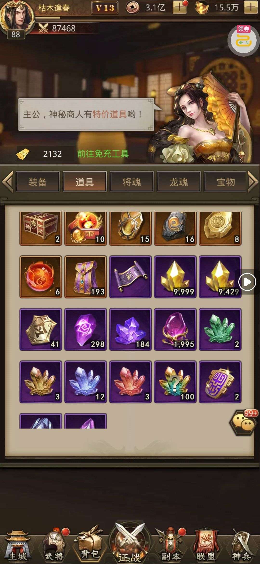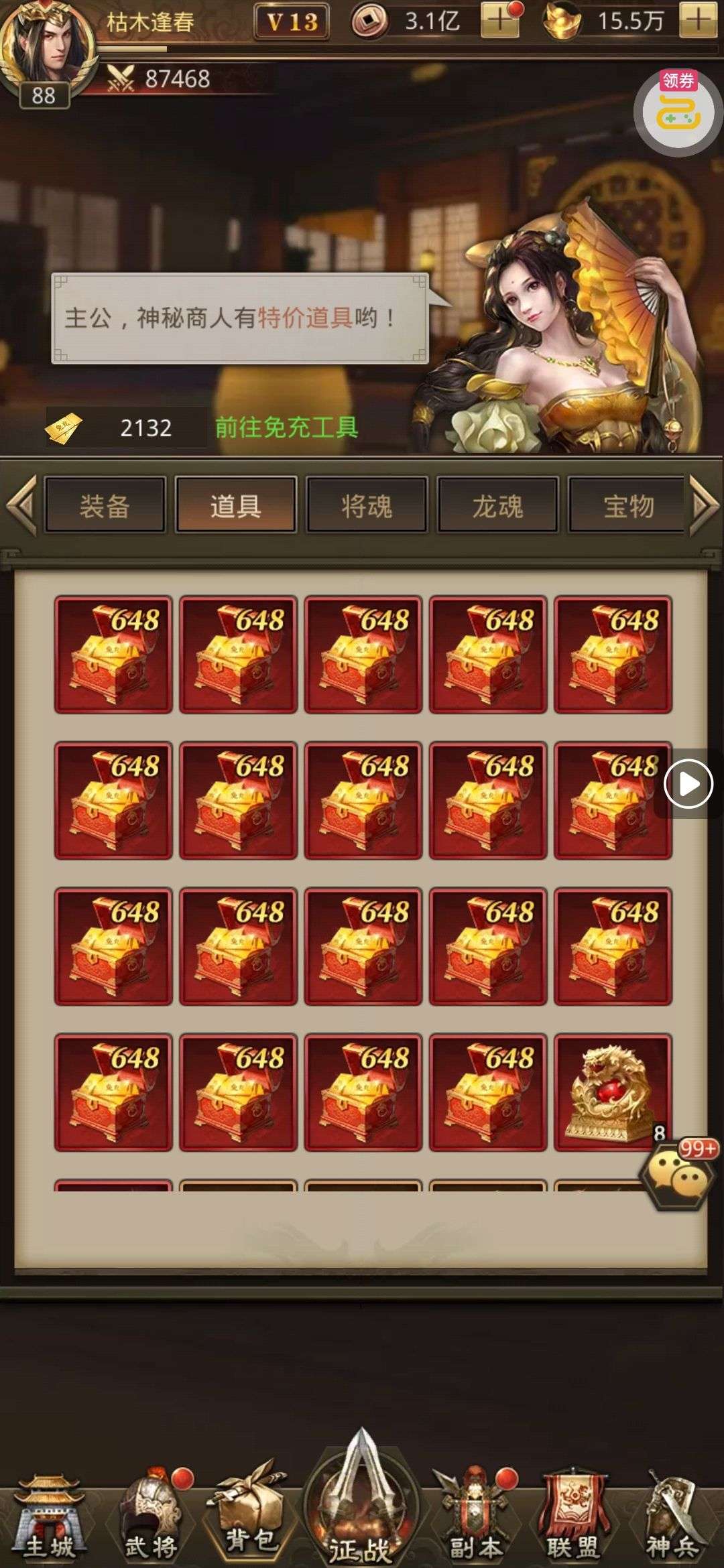 夺宝券*1、比武令*1、5星随机将魂*10(每个账号限领一次)
