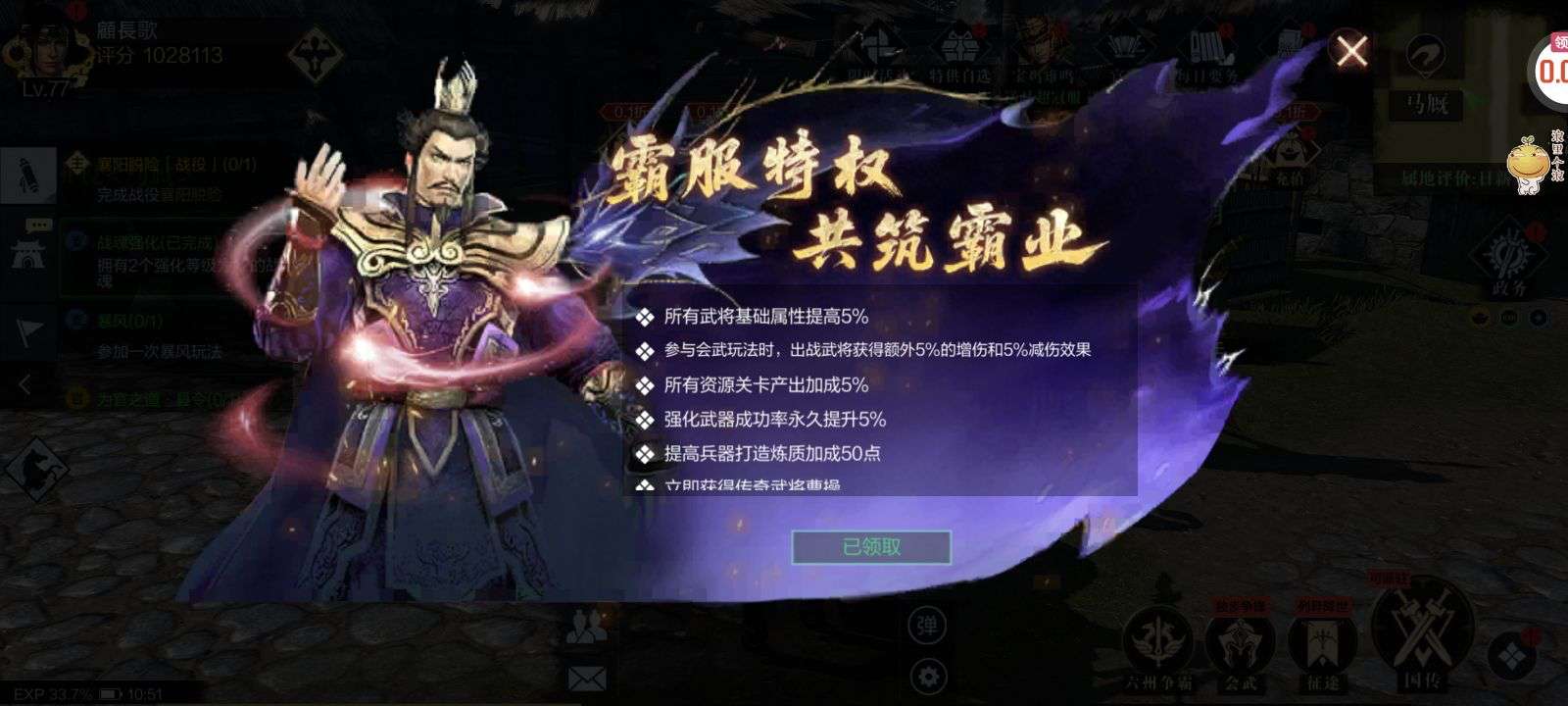夺宝券*1、比武令*1、5星随机将魂*10(每个账号限领一次)