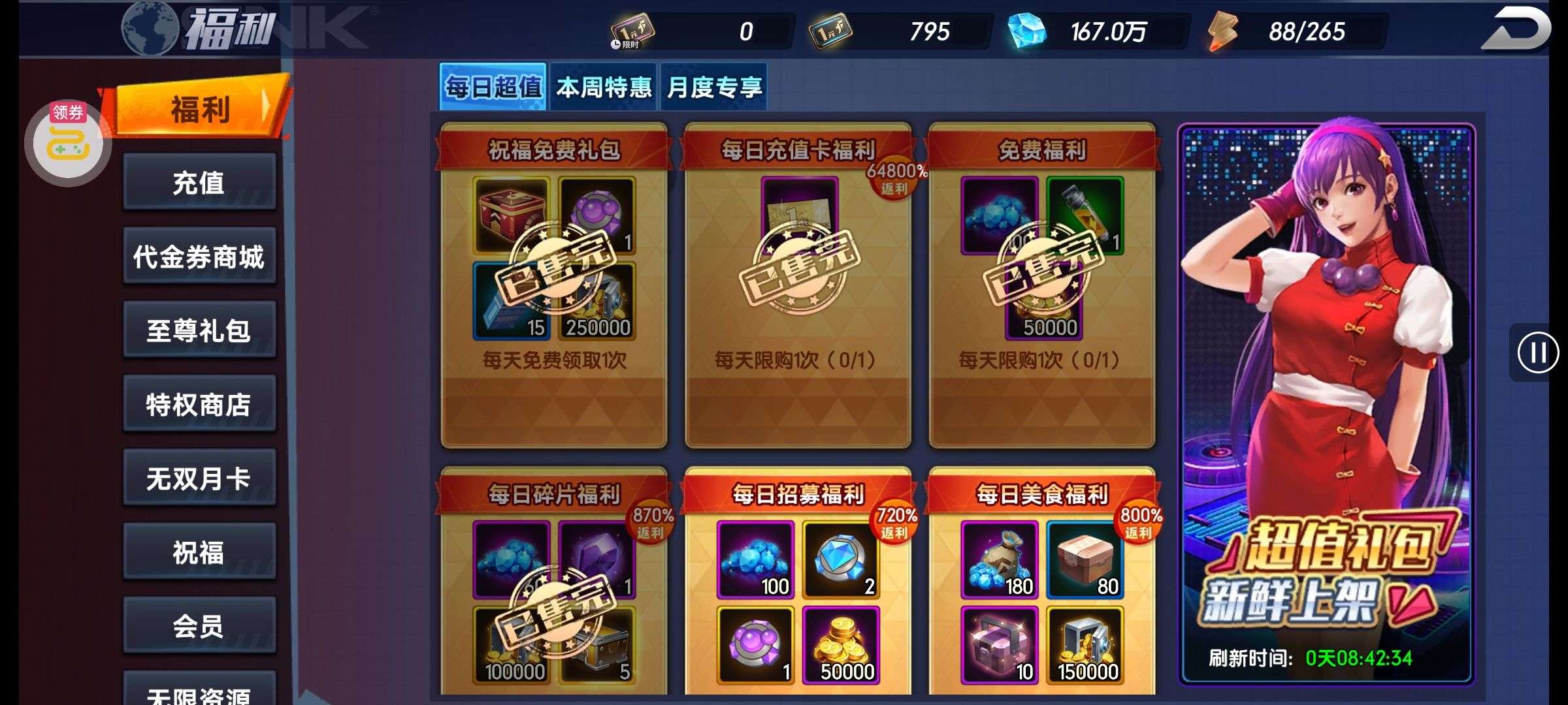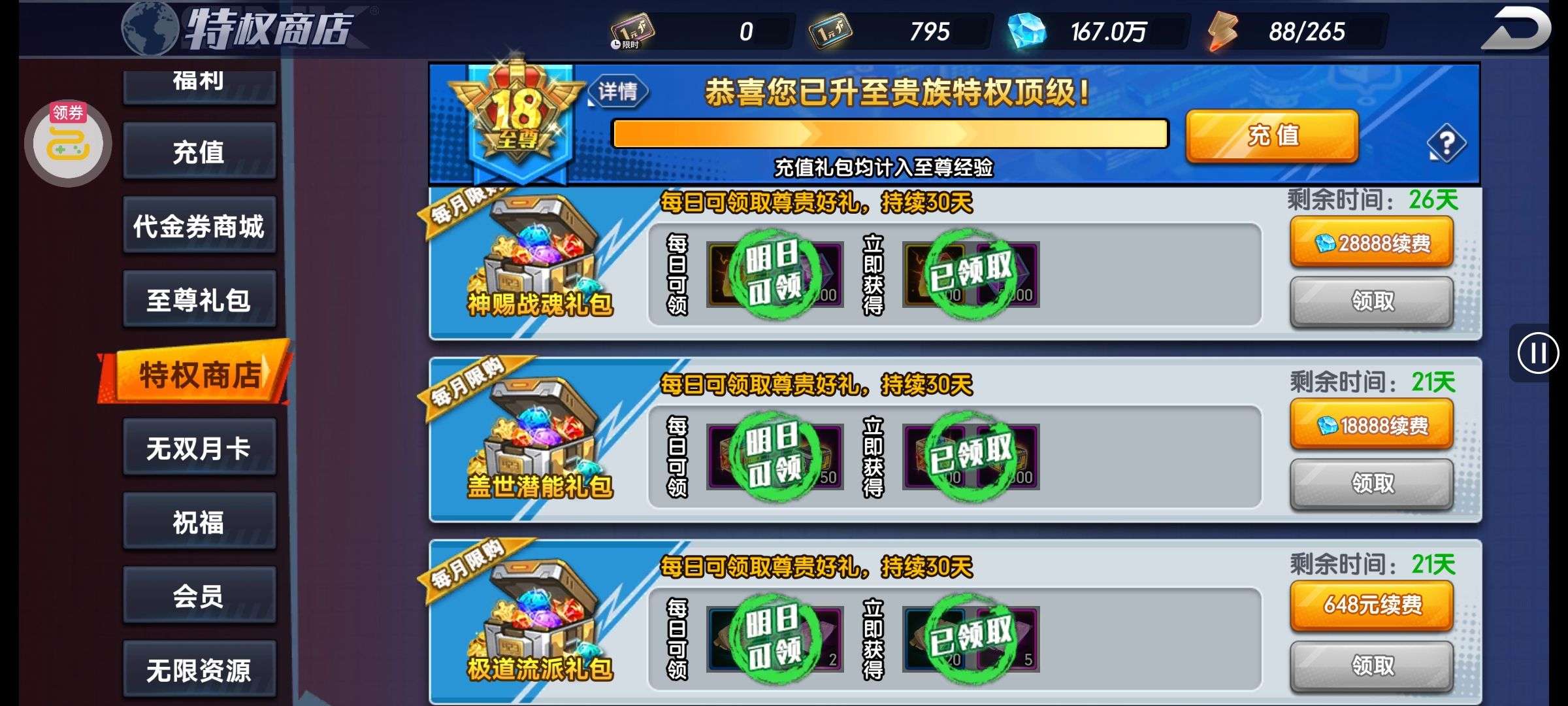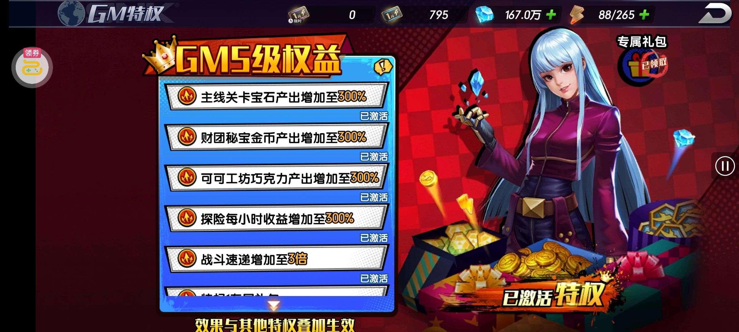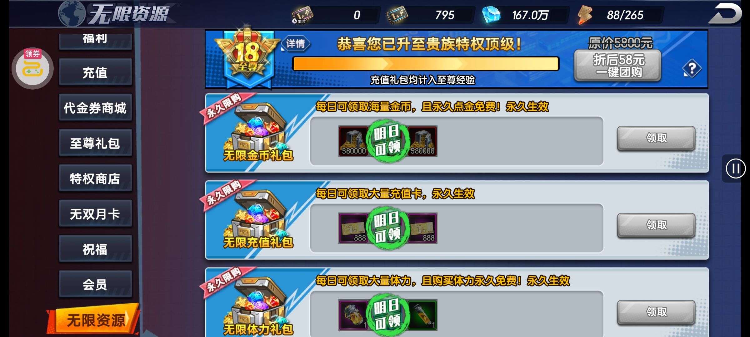 超多好东西,战力也嘎嘎厉害,全部 vip 升满,买了零氪继续玩就行。