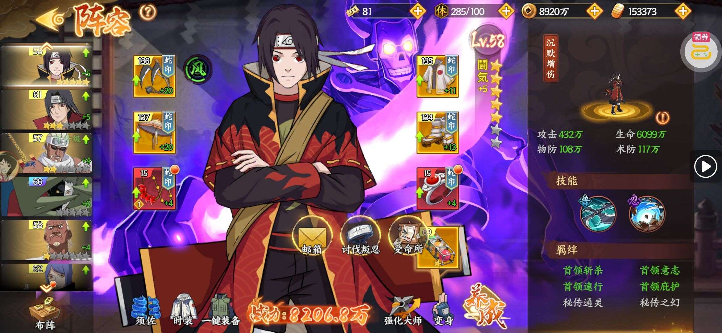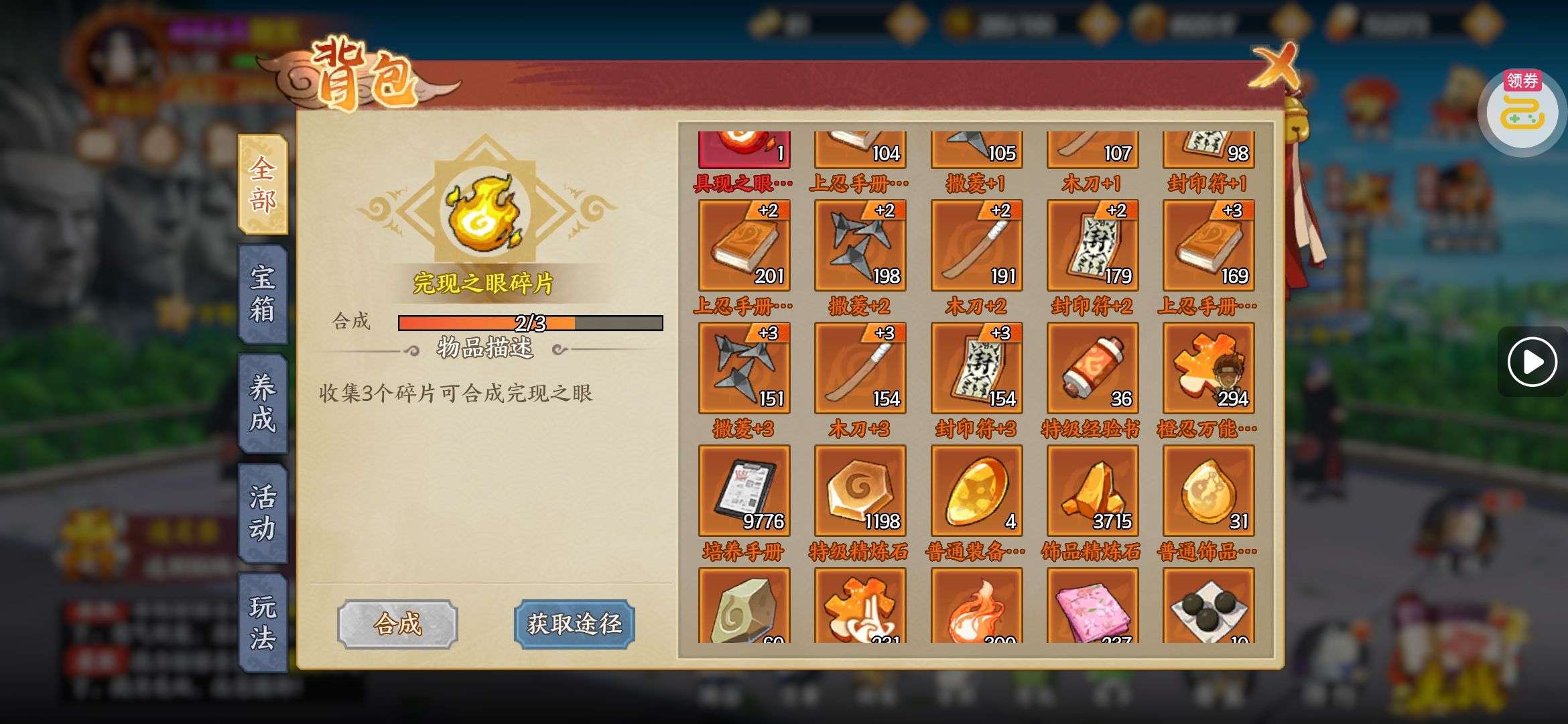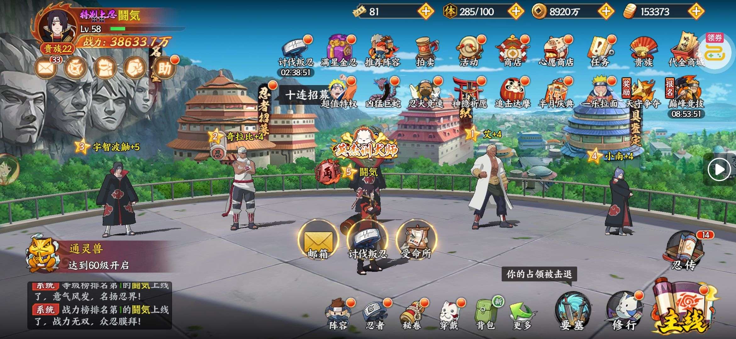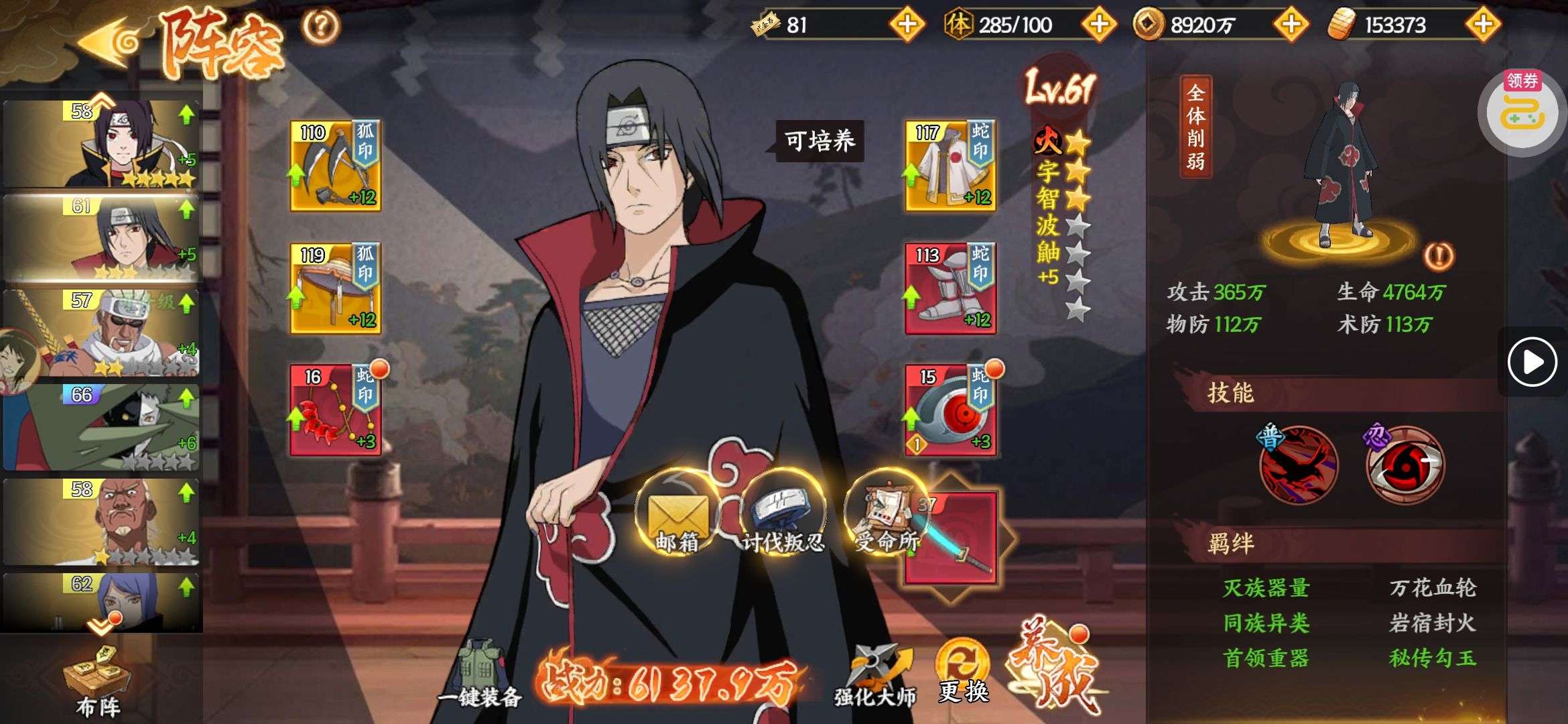 战斗力第一,164亿战斗力。季卡会员,有赤金忍者小南,兜;紫金全套忍者。账号金币有100万。养成材料n+
