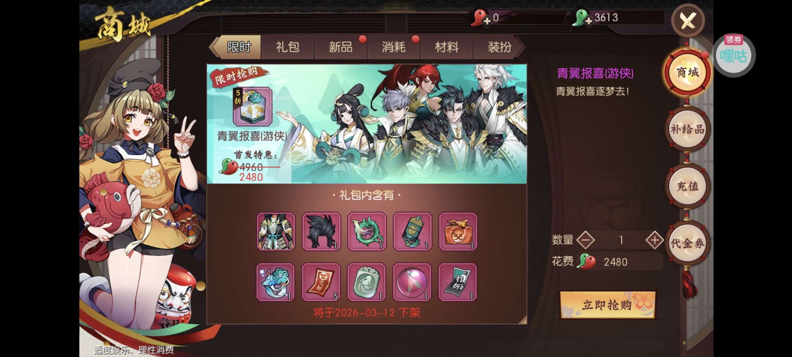 夺宝券*1、比武令*1、5星随机将魂*10(每个账号限领一次)