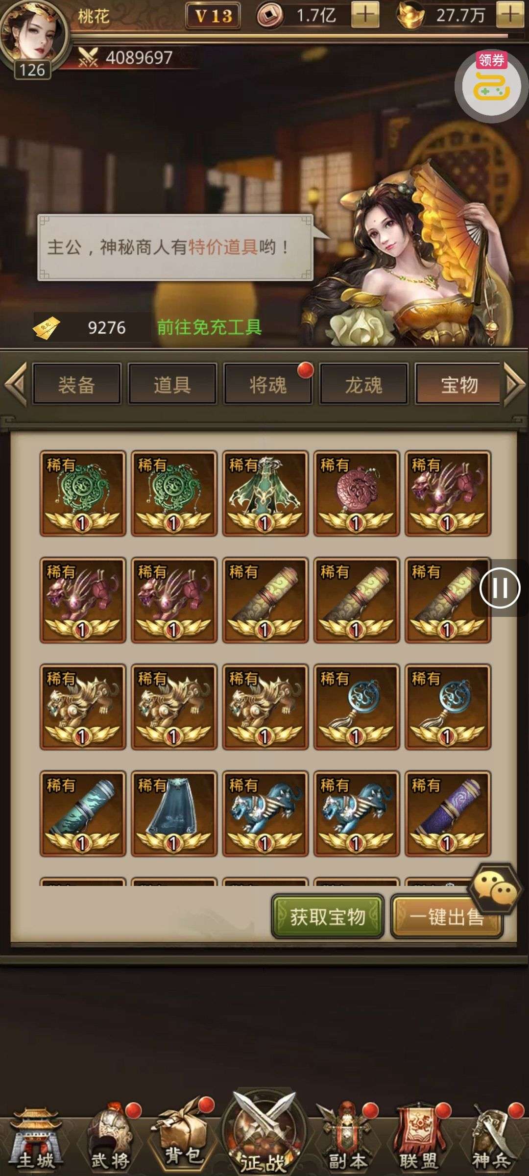 夺宝券*1、比武令*1、5星随机将魂*10(每个账号限领一次)