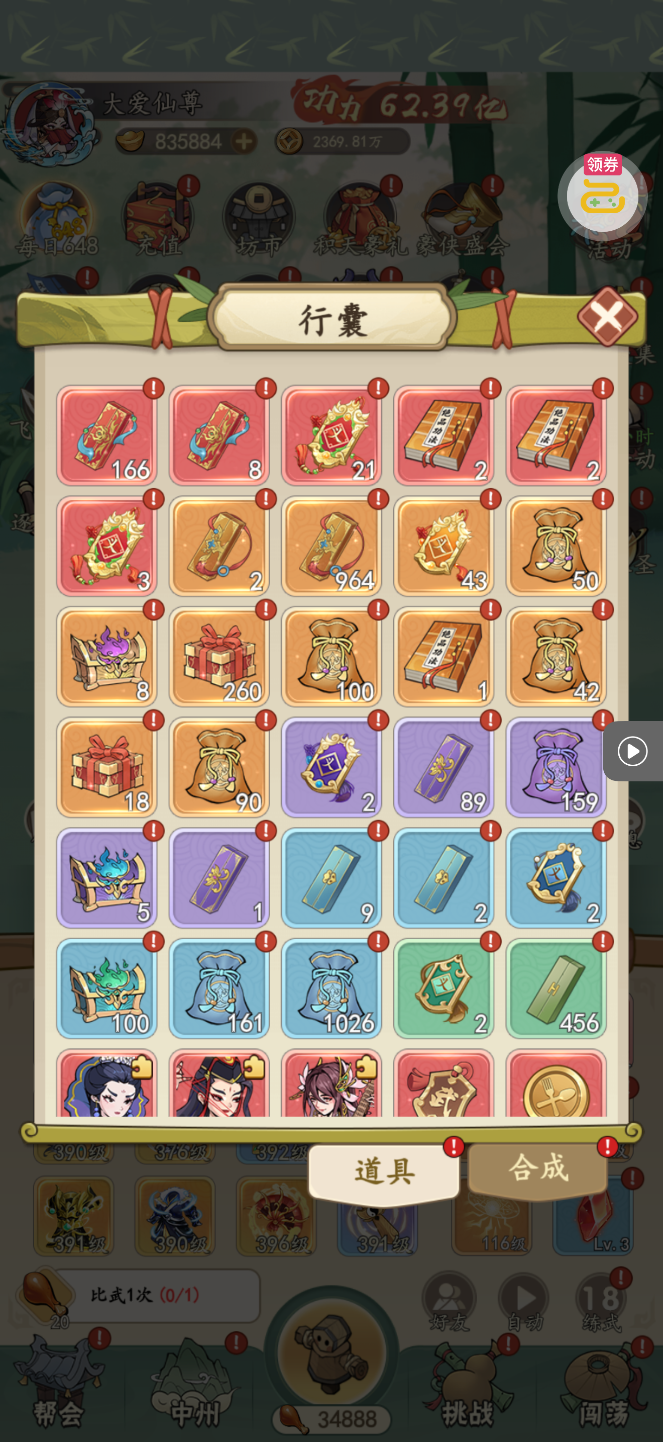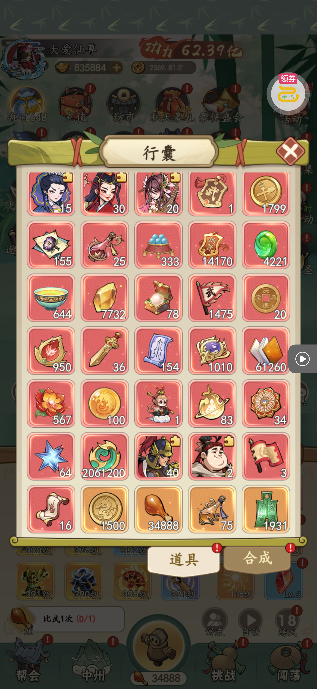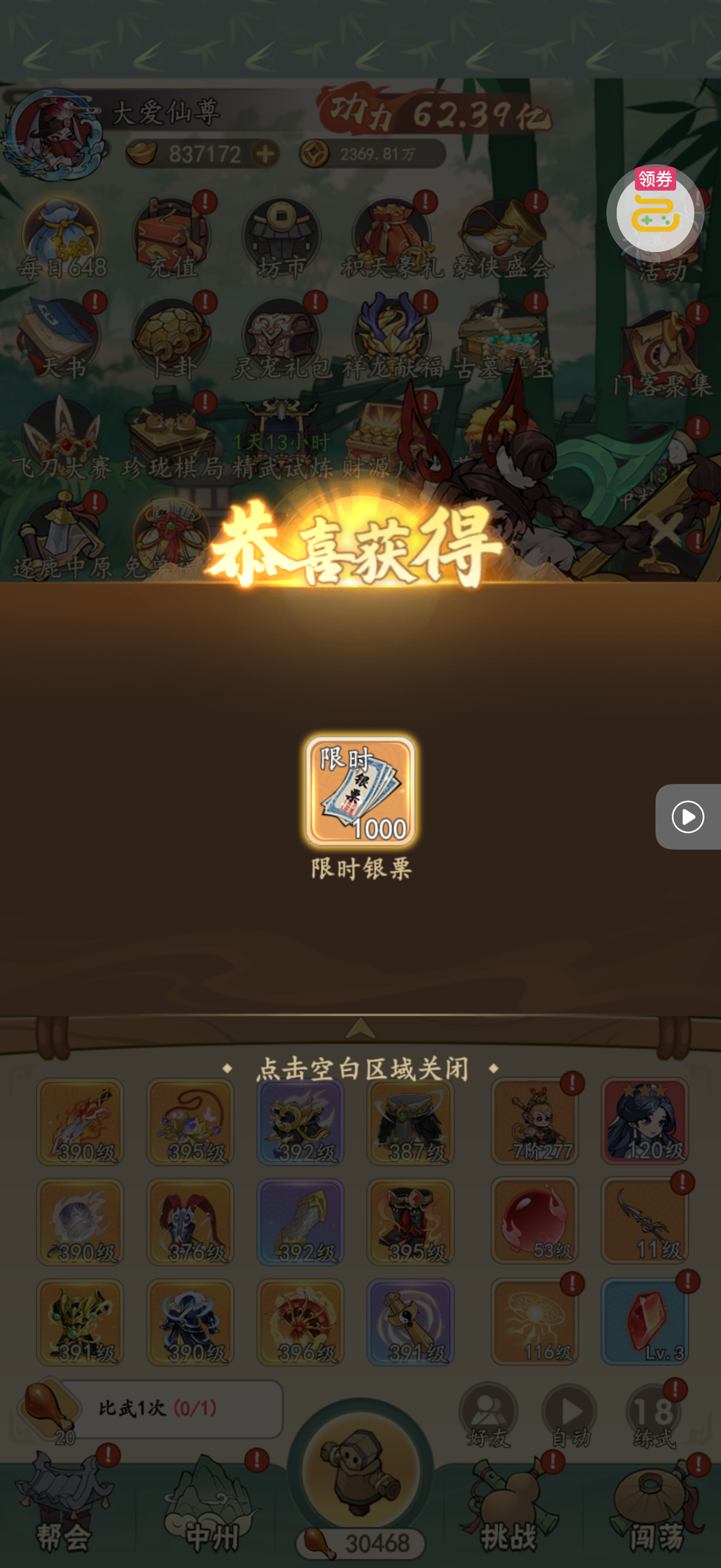 夺宝券*1、比武令*1、5星随机将魂*10(每个账号限领一次)
