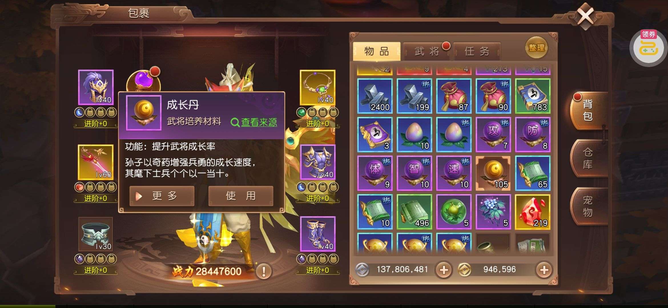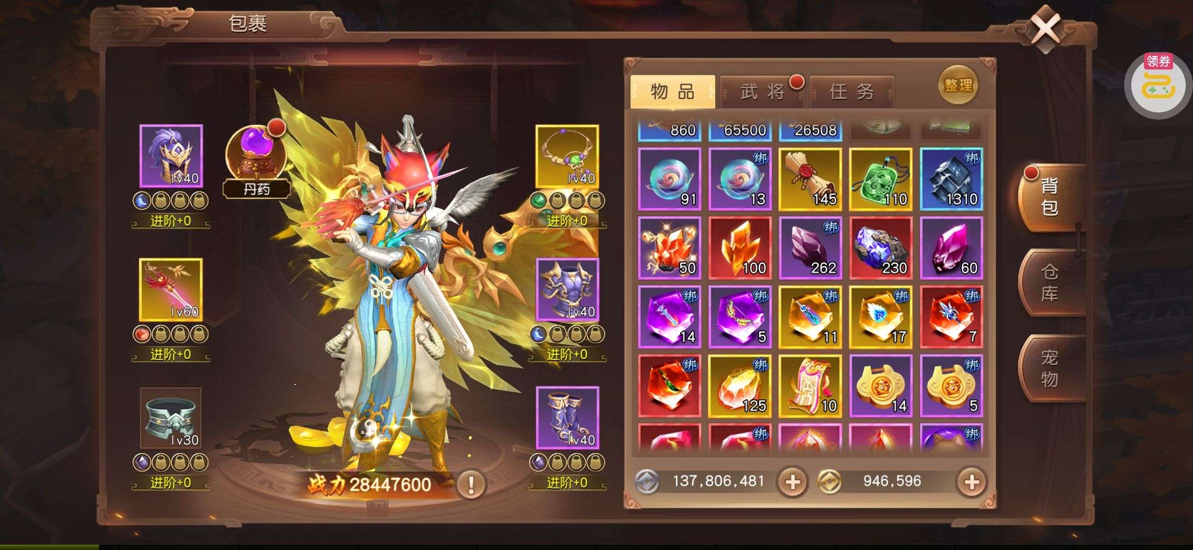 夺宝券*1、比武令*1、5星随机将魂*10(每个账号限领一次)