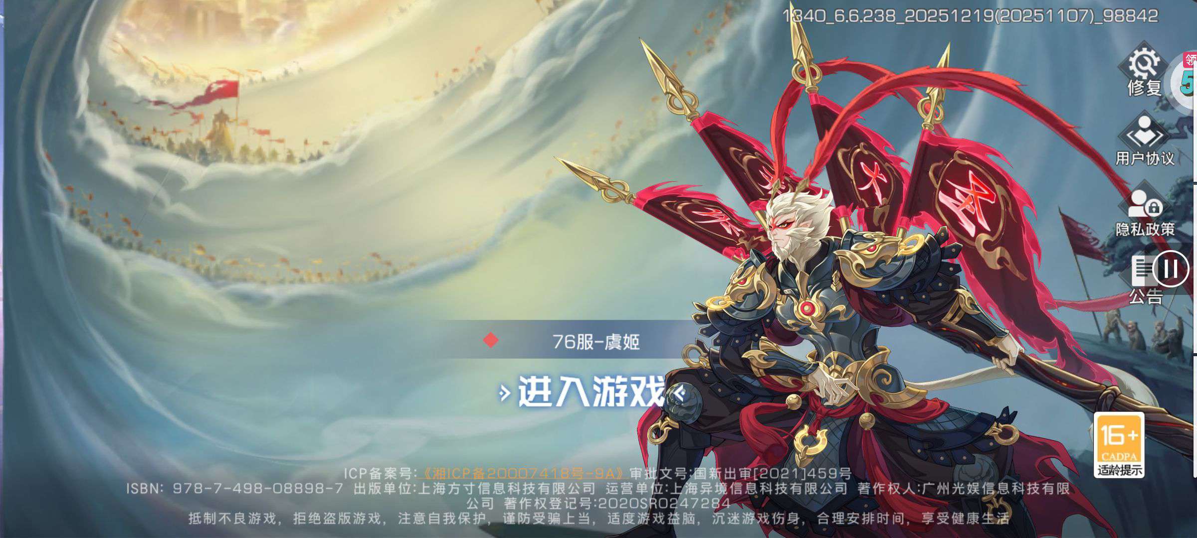 夺宝券*1、比武令*1、5星随机将魂*10(每个账号限领一次)