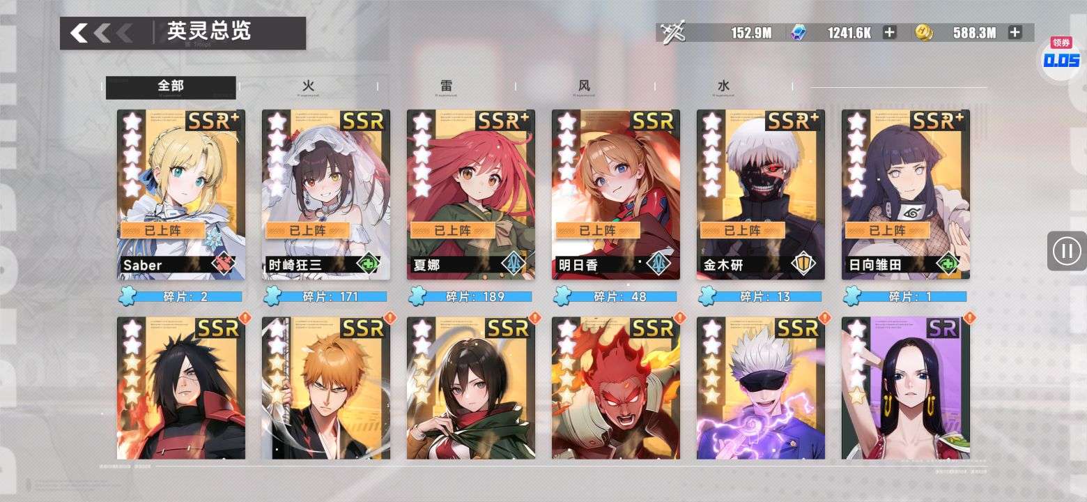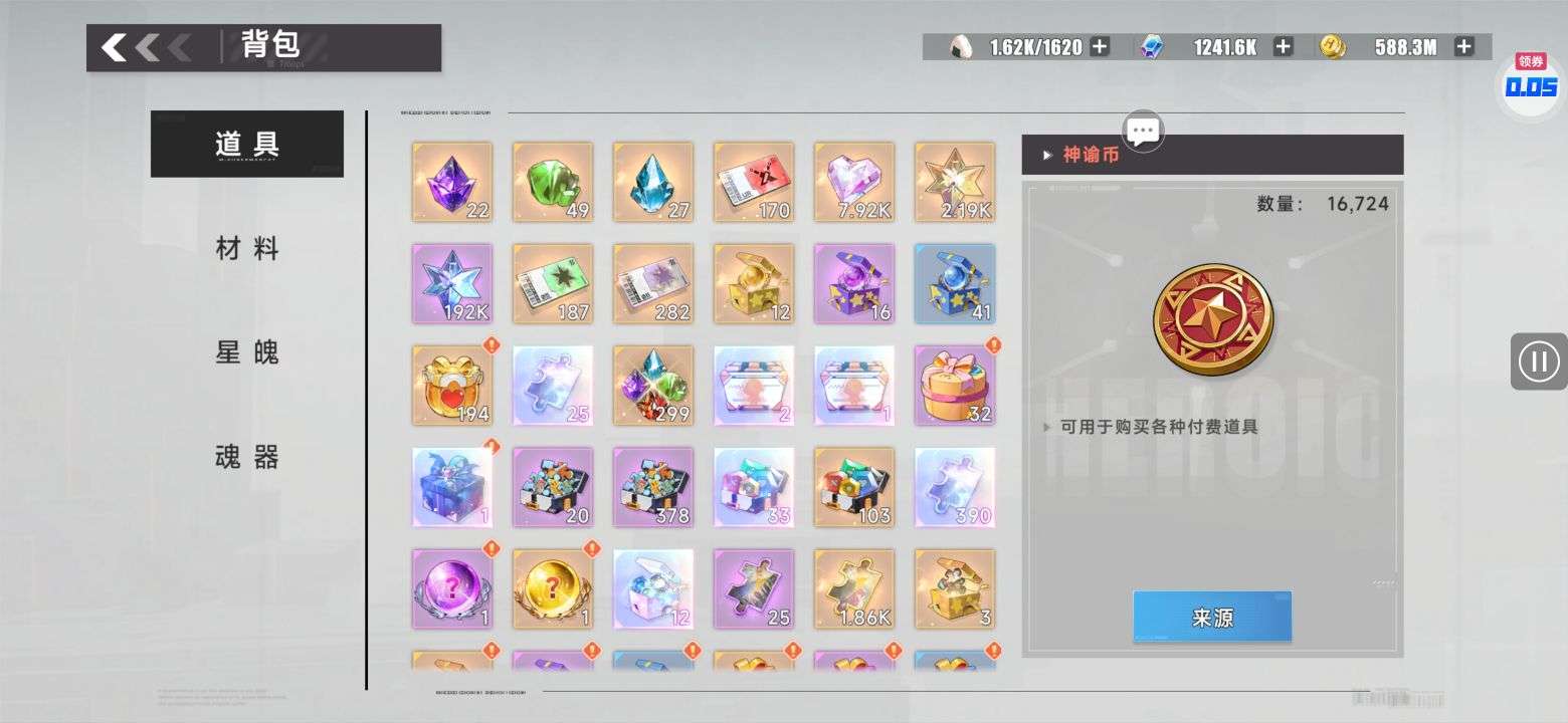 角色等级刚刚满级,还有2万神渝币,有夏娜,金木研,纳兹的专属魂器,限时魂器也有700抽,仓库里面东西也很多可砍价